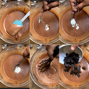 After 30 minutes, check the consistency of batter. If it has turned too thick, you can add bit of milk but we didn’t need to add as the consistency was perfectly fine. Add baking soda, baking powder and vinegar. Mix well. Then add chopped chocolate chunks.
