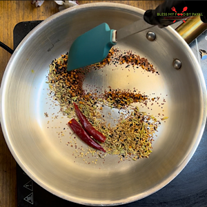 Take cumin seeds, mustard seeds (Rye), fennel seeds, yellow or black mustards, Nigella seeds, carom seeds, Fenugreek seeds and dry red chilies in a pan. Dry roast them on low heat for 2-3 minutes or until aromatic.
