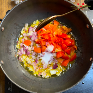 - Add ginger, onion, tomatoes and salt. Mix.