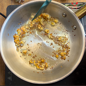- Heat desi ghee in a pan and add cumin seeds, hing and garlic.
