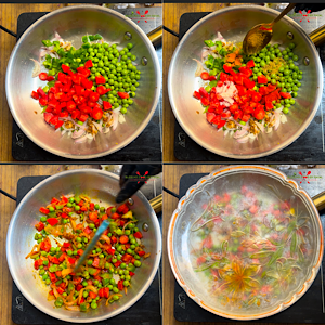 - Add capsicum, carrot, green peas, red chilli powder, turmeric powder, coriander powder, garam masala and salt.