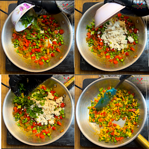 - Lastly add scrambled tofu, spring onion greens and coriander leaves.