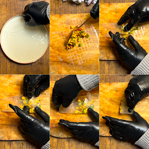 - Now take one more rice paper, wet it likewise and wrap up the first parcel in it. In simple terms, double wrap the stuffing for extra crispiness.