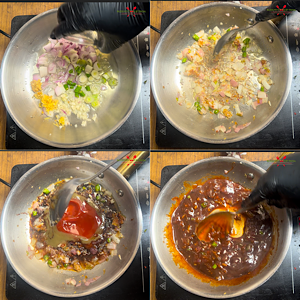 Take sesame oil in a pan and add spring onion bulbs, onion, ginger, garlic and green chilies. Saute and cook until onion turns slightly brown. Add white vinegar, Red or green chilli sauce, soy sauce and tomato ketchup. Cook for a minute.