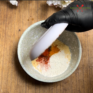 - In a small bowl, add besan, cornflour, red chilli powder, turmeric powder, roasted cumin powder, garam masala & salt.