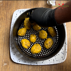 Air fry @190°C for 10 minutes initially. After 10 minutes, brush the potatoes with oil and further air fry for 5 more minutes or until they turn brown and crisp. Aloo Barule are ready.
