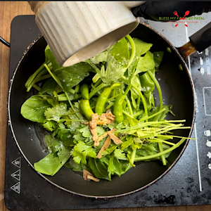 - Add spinach, coriander, green chilies, ginger, sugar and water in a pan.