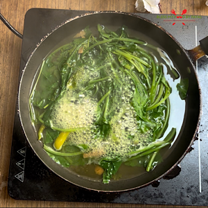 Boil 8-10 minutes until raw aroma of spinach goes away.