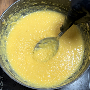 Soon you will find there will be no grain at all and it’s all smooth and creamy batter like stuff in the pan. Our dal is ready. Off the heat.
