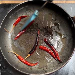 - Add dry red chilies and oil in a pan.