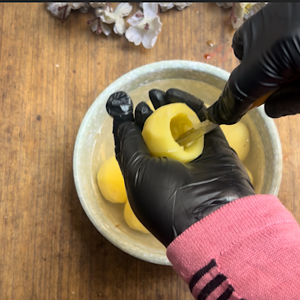 - Scoop out the middle of each potato using a peeler or small knife or back side of spoon. Be careful not to break the tomato shell and do not make the hole at the bottom of potatoes.