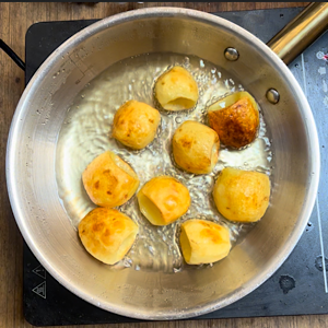 - Keep turning their sides so that they get cooked from all the sides. We have to fry till they turn golden brown.
