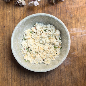 Till the potatoes are cooling down, prepare the stuffing for which take paneer, khoya, cashews, almonds, raisins, onion, green chilli, salt and coriander leaves. Give them a good mix.