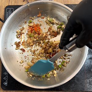- Add pounded masala and roast for couple of seconds.