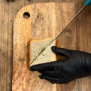 - Cut bread slices into halves giving them a diagonal shape. Keep aside.