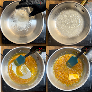 Add sugar and water in a pan. Cook on low heat while stirring. Initially sugar will melt. Soon sugar will start turning brown. When sugar turns brown, add butter. Let butter melt completely.