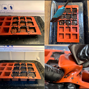 • Once properly coated, flip the mould over the bowl carrying chocolate so that extra chocolate drips out of the mould.