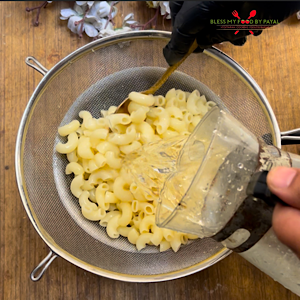 Drain the pasta but don’t discard the water. We will use a part of it. Run cold water through the pasta so that the cooking process stops.