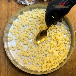 - Transfer and spread boiled pasta in a greased plate. This will help the pasta not to stick to each other. Keep aside.