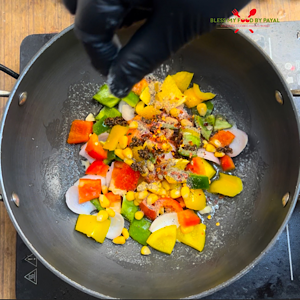 Add onion cubes, bell pepper cubes, sweet corns, black pepper powder, Oregano, red chilli flakes and salt. Be careful while adding salt because mayonnaise too has salt. Saute the veggies for a minute or two on high heat. Don’t let the crunch of veggies go.