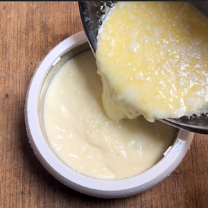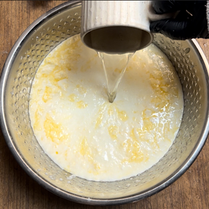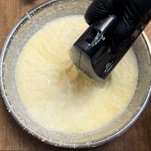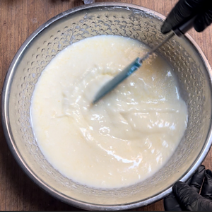 • Mix well. Right now the temperature of this mixture should be at luke warm, appropriate to set the curd.