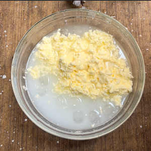 • Collect the butter and add to a bowl carrying ice cold chilled water. It will wash, as well as harden the butter. And here our butter is ready. If you want to use it as a butter, just squeeze it and keep.