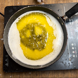 Put the pan on low heat and let the butter melt. When butter is completely melted, simmer it for 4-5 minutes. You can see 3 layers, heavy white base, which may have buttermilk, yellow ghee in the middle and foam on the top. Switch off the heat and leave it undisturbed for 5-7 minutes.