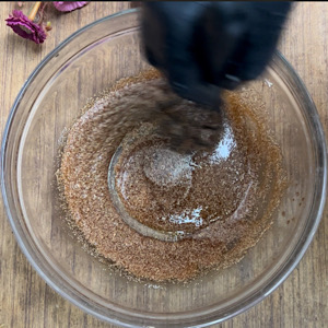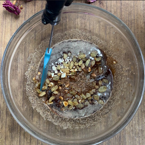 Take a bowl and add sugar, whey, cardamom powder, baking powder, nutmeg powder, desi ghee and semolina.