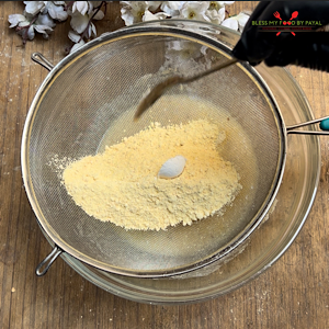 - Put a sieve on the bowl and add roasted besan, baking powder and salt.