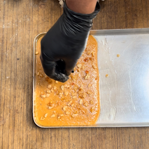 - While the khoya is hot, sprinkle the gond all the surface of khoya, like we generally do with nuts.