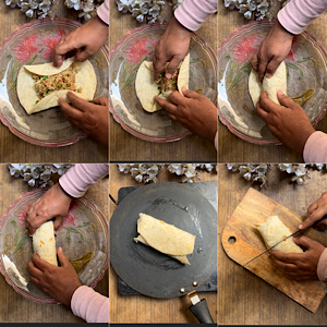 Fold the left and right sides inward over the filling. Fold the bottom edge up over the fillings, tucking everything in. Starting from the bottom, roll the tortilla away from you, keeping it snug. Fold the sides in again at the end to seal tightly. Apply little oil on skillet/tawa. Lightly toast the burrito for 1–2 minutes. Cut from the middle.