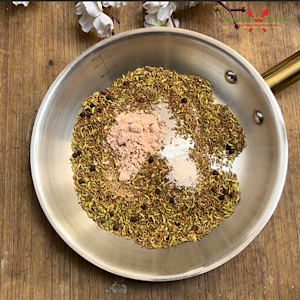 - Take a pan and add cumin seeds (Jeera), carom seeds (ajwain), fennel seeds (sounf), black pepper (kali mirch) and fenugreek seeds (methi dana).