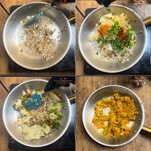 - Add boiled and mashed potatoes and green peas (both preferably boiled a day before or atleast 4-5 hours ago).