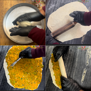 Knead the dough just for a minute. Dust some flour on a clean surface and roll the dough almost to the thickness of a roti. Spread the potato stuffing on this roti properly but leave a little space at the end of one side. Start rolling the roti tightly beginning from the end exactly opposite to that blank end.