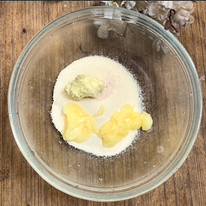 • Take a bowl and add semolina, salt, desi ghee and khoya.