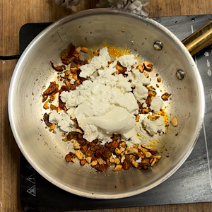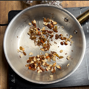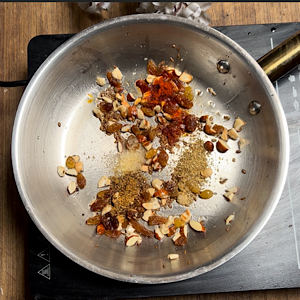 • Heat oil in a pan and add cumin, cashews and almonds. Saute till cumin turns brown.
