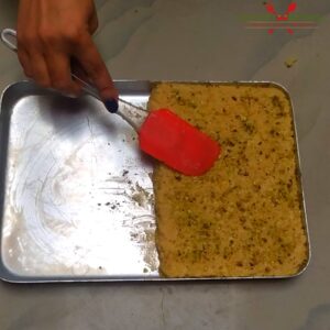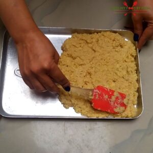 - Immediately transfer the hot mixture into the tray greased with desi ghee and level it with spatula.