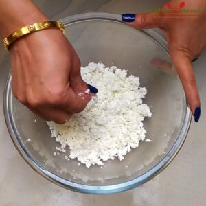 - Add paneer in it and crumble using your finger tips. Don’t spoil the crumbly texture of paneer by over mashing it. Paneer needs to be grainy along with crumbly.