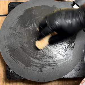 - Take some paste and spread it on the tawa giving it a round shape using hand.
