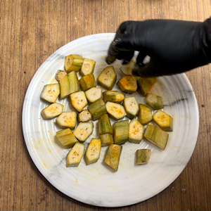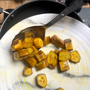 - Apply bit of salt and 1/4 tsp of turmeric powder to the banana pieces. Keep aside.