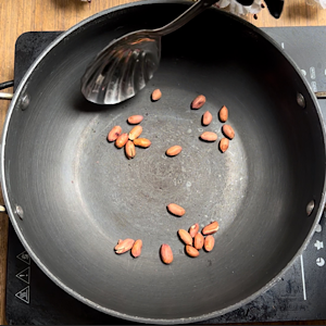 - Add peanuts in a pan and dry roast them on low heat until slightly brown. Take them out.
