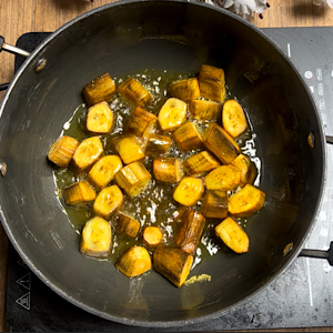 - Take a reasonable quantity of oil in the same pan and when oil is hot, add banana pieces.