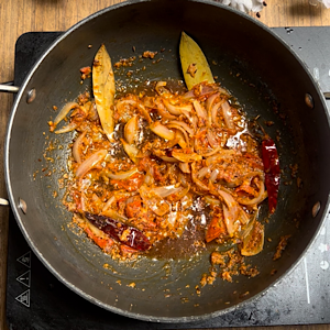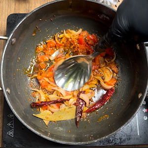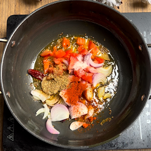 - Add cumin seeds, bay leaves, ginger garlic paste, onion, tomatoes, red chilli powder, coriander powder and salt.