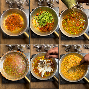 - Add green peas and roast them for 2 minutes while stirring continuously.