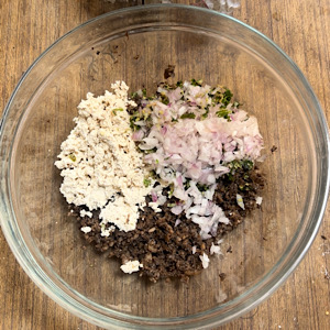 - Add crumbled tofu and chopped onion & coriander mixture.
