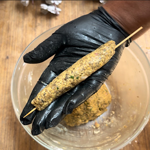 - Using wet hands, wrap the dough around skewers giving it a cylindrical shape, like that of a seekh kebab.