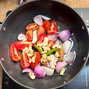 • For making PUREE, add onion, tomatoes, ginger, garlic, green chilies, green cardamoms, cashews and water in a pan.