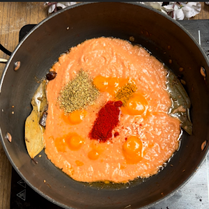 • Add puree, salt, turmeric powder, red chilli powder and coriander powder.