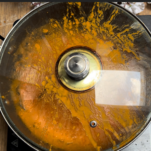 • Put a lid and let it cook. As the paste is having onion paste too, it will splash so cook with a lid.
