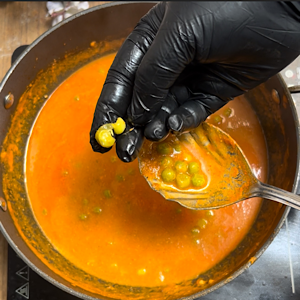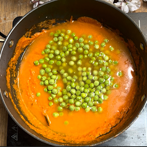 • When you see the oil separating, add green peas and water. Mix.